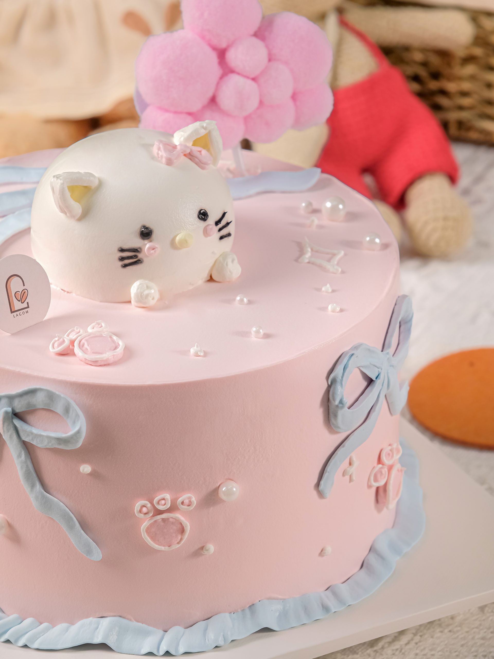 Gato Bé Mèo Nhỏ là chiếc bánh sinh nhật ngọt ngào dành cho những bé gái yêu mèo. Bánh nổi bật với tông màu hồng pastel dịu dàng, được trang trí bằng chiếc nơ ruy băng màu xanh da trời nhạt và các dấu chân mèo nhỏ xinh xắn. Điểm nhấn chính là Bé Mèo Trắng tròn trĩnh trên bánh. Thiết kế này vừa xinh xắn, đáng yêu, vừa mang lại cảm giác dễ chịu.