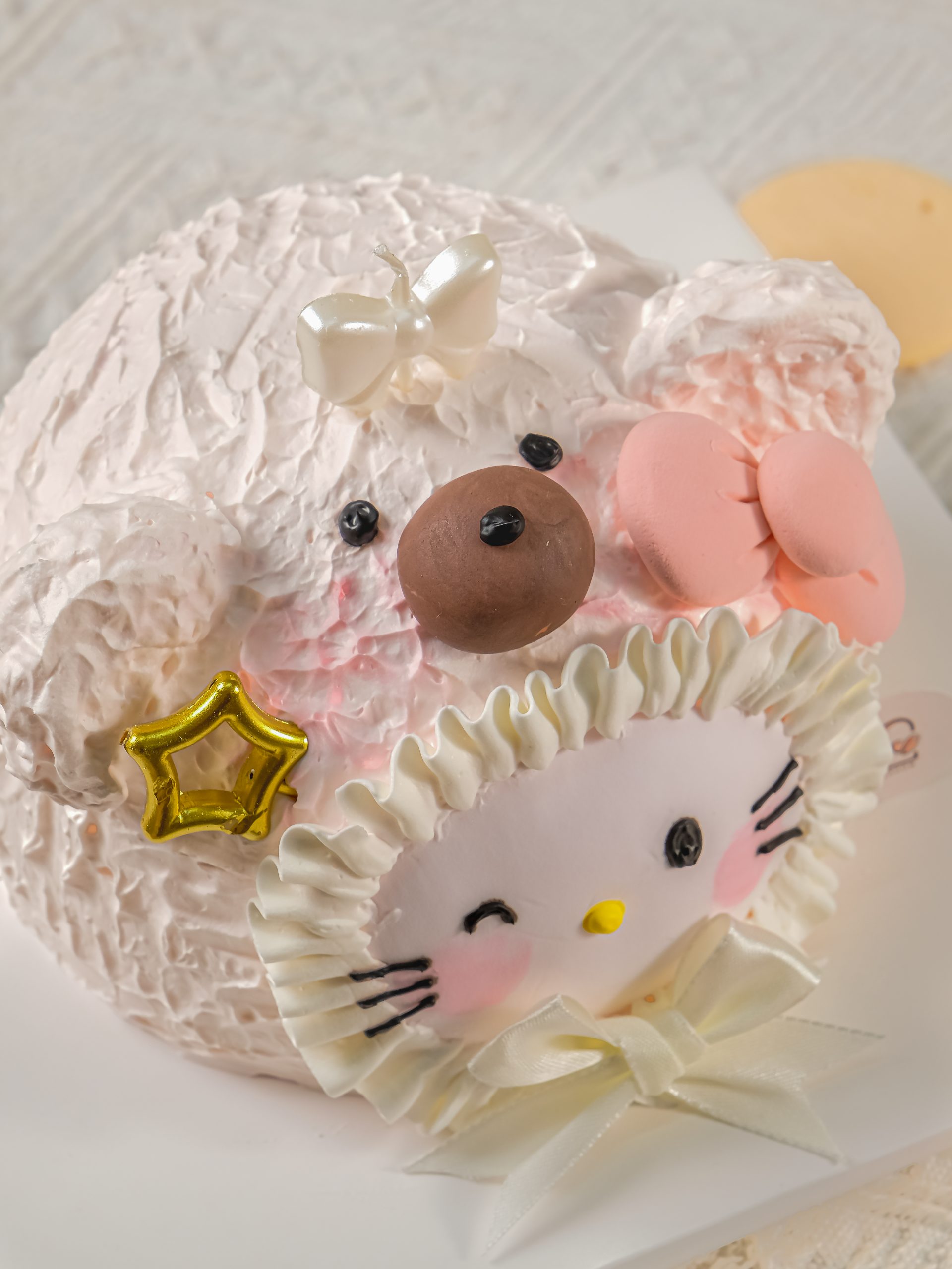 Gato Kitty Hồng là chiếc bánh sinh nhật đặc biệt và lãng mạn với tạo hình tròn trịa của khuôn mặt Hello Kitty. Bánh được phủ kem màu hồng pastel nhẹ nhàng, kết hợp với các chi tiết kem bèo nhún trắng và chiếc nơ lụa trắng xinh xắn. Các chi tiết tai gấu/mèo và ngôi sao vàng làm tăng thêm sự ngộ nghĩnh. Thiết kế này cực kỳ ngọt ngào và cuốn hút, phù hợp với những bé gái yêu thích phong cách công chúa.