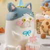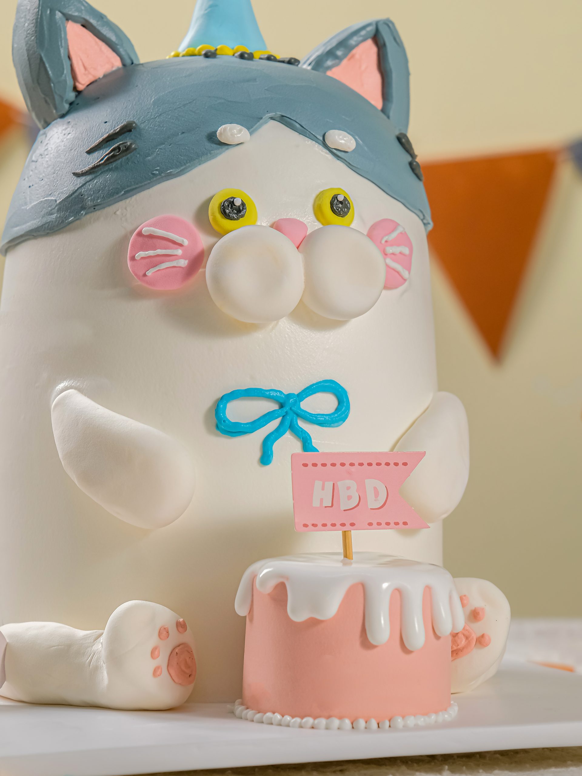 Gato Meow Meow là chiếc bánh sinh nhật với thiết kế đáng yêu và đầy sống động, mang đến một người bạn nhỏ dễ thương cho bữa tiệc của bé. Bánh nổi bật với tạo hình chú mèo trắng muốt có dáng ngồi tròn trịa, đội chiếc mũ sinh nhật xanh dương nhỏ xinh trên đầu. Điểm nhấn là khuôn mặt mèo với đôi mắt vàng tròn xoe, chiếc mũi hồng đáng yêu và chiếc nơ xanh thắt duyên dáng ở cổ. Đi kèm bên cạnh chú mèo là một chiếc bánh kem mini màu hồng xinh xắn, tạo nên một khung cảnh sinh nhật vô cùng ấm áp và ngọt ngào.