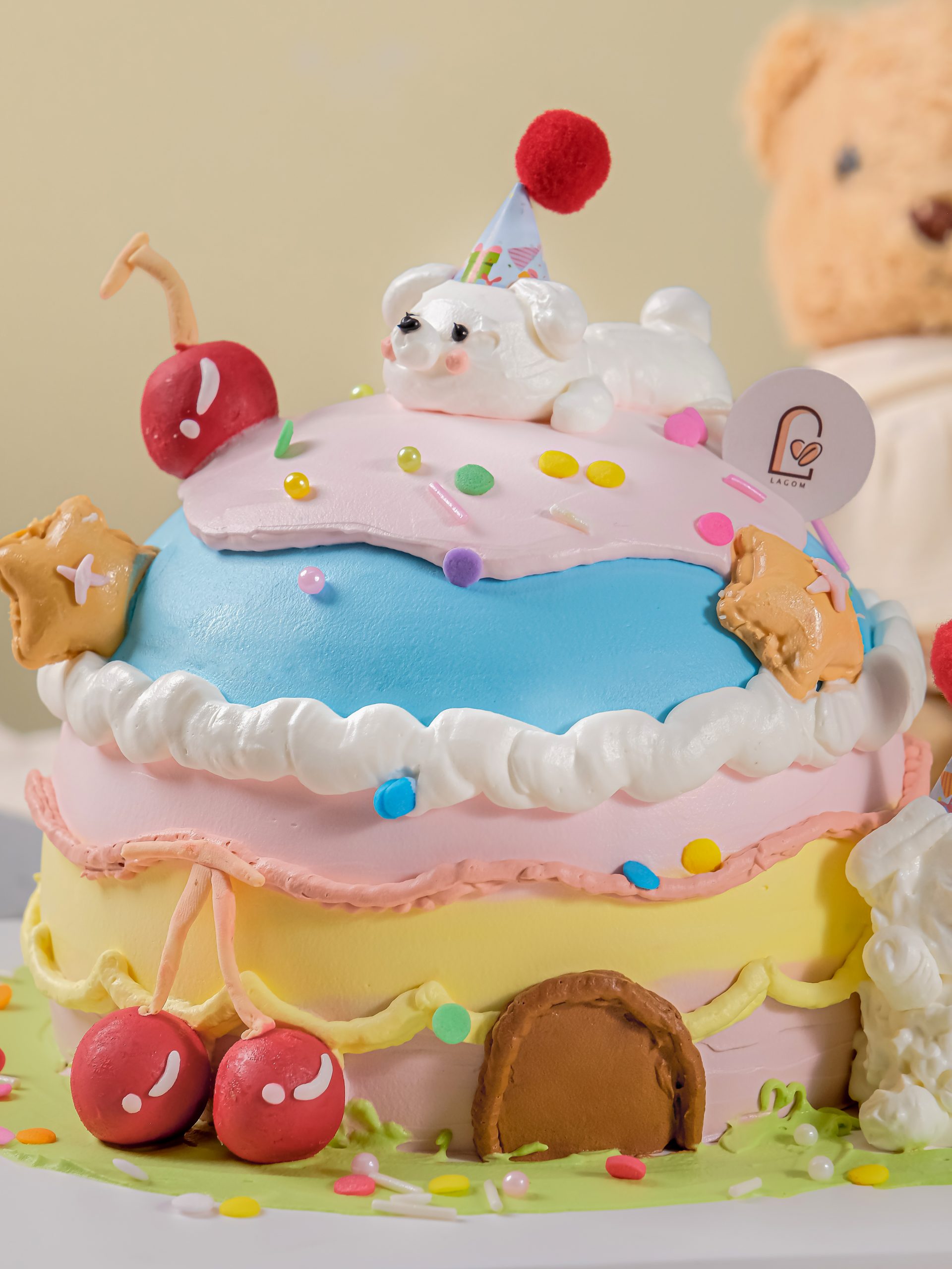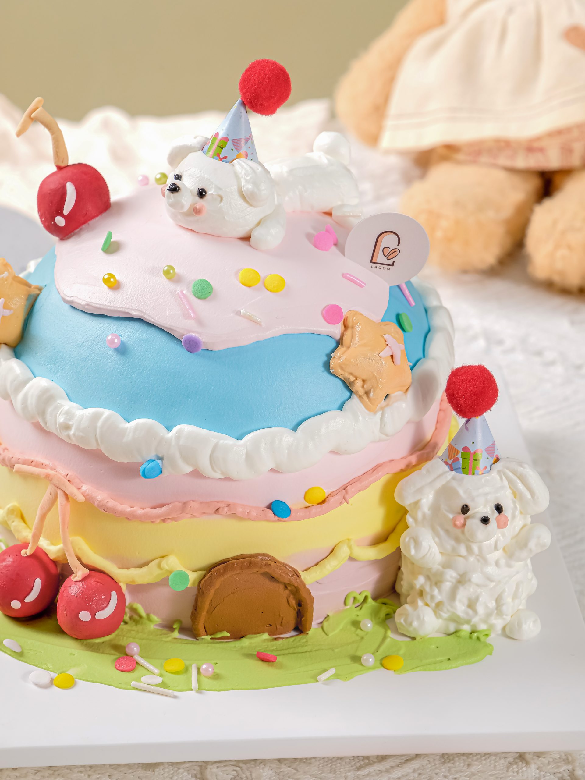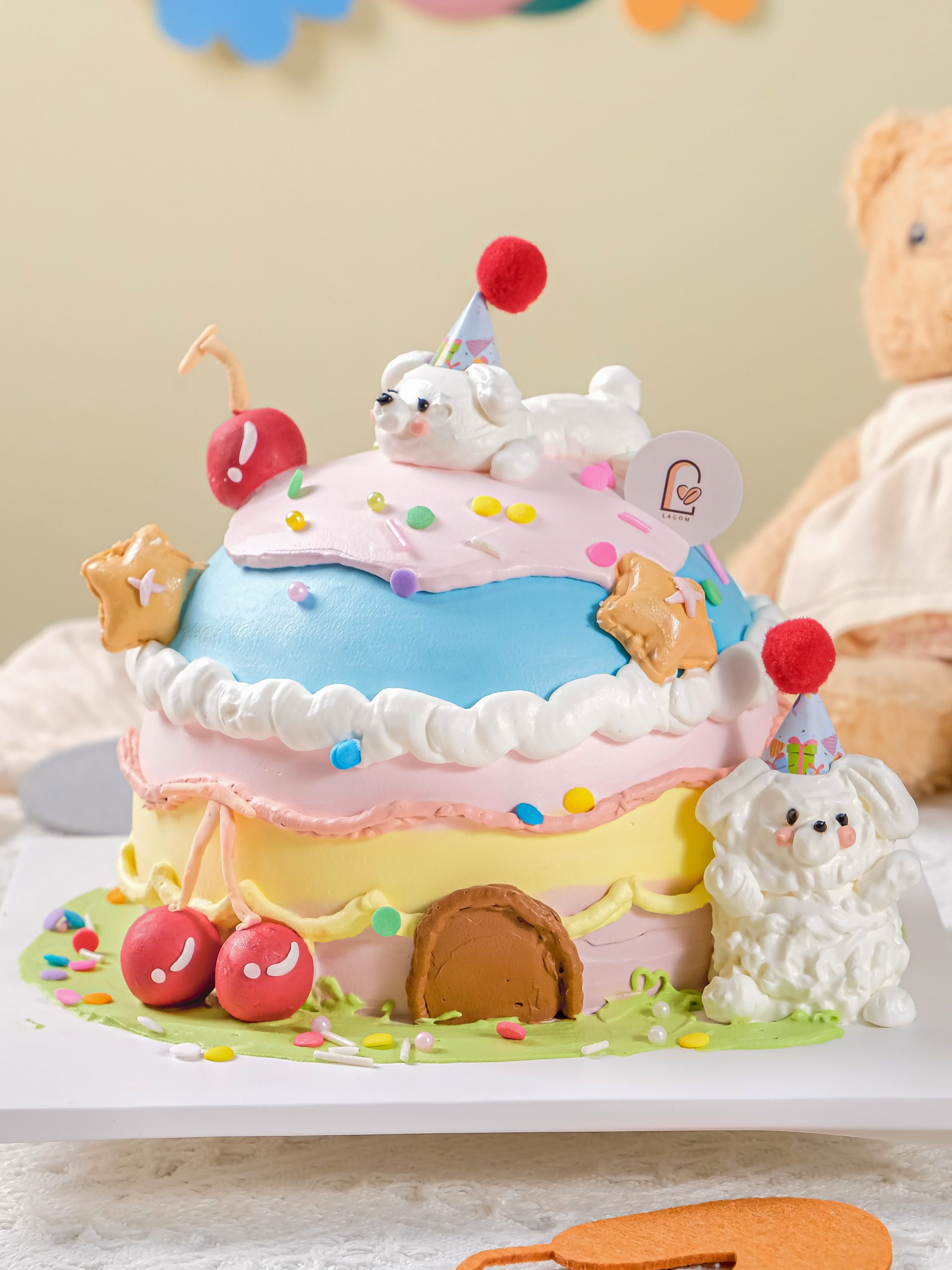 Gato Ngôi Nhà Bánh Ngọt là chiếc bánh sinh nhật đầy màu sắc và chi tiết, mang đến một thế giới cổ tích thu nhỏ. Bánh được thiết kế nhiều tầng với sự kết hợp của các màu Pastel vui tươi. Nổi bật là các chi tiết ngộ nghĩnh như mô hình chú chó nhỏ đội mũ, trái cherry bóng bẩy, và ngôi sao bánh quy. Chiếc bánh cực kỳ ấn tượng và độc đáo, hoàn hảo cho các bé thích khám phá và yêu thích màu sắc rực rỡ.