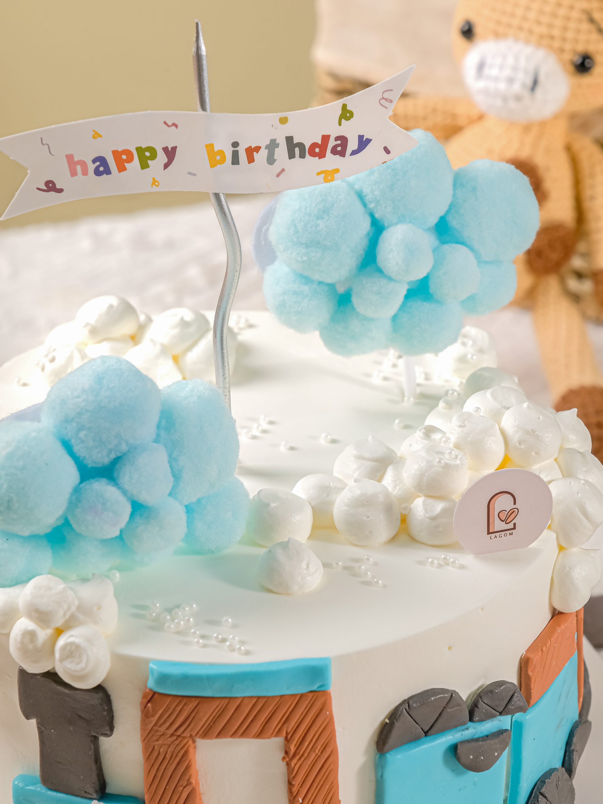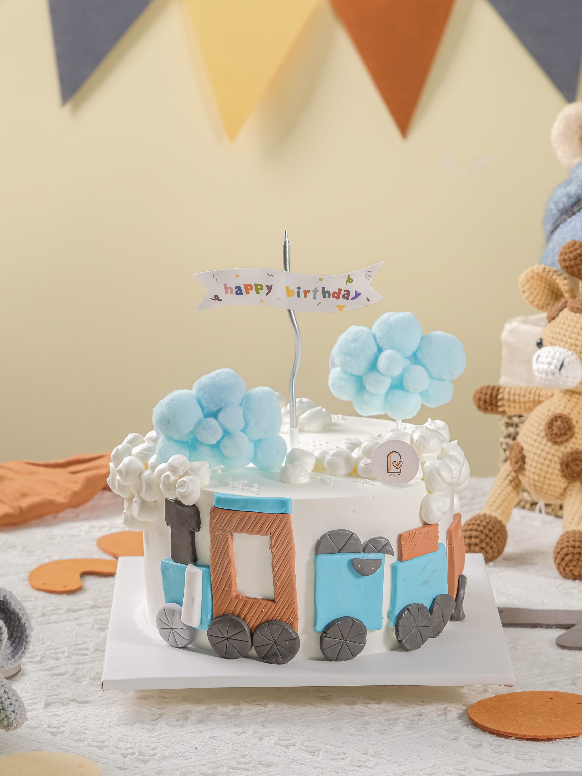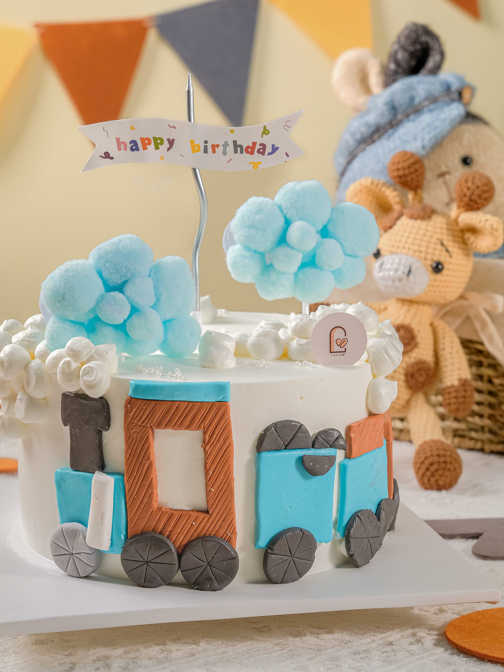 Gato Tàu Hỏa là chiếc bánh sinh nhật với thiết kế năng động và đầy màu sắc, mô phỏng một chuyến tàu hỏa đang băng qua những tầng mây bồng bềnh. Bánh nổi bật với tạo hình đoàn tàu nhiều toa được làm từ những mảng màu đối lập, chạy dọc theo thân bánh trắng muốt. Điểm nhấn đặc biệt là những “đám mây” xanh lơ êm ái trên đỉnh bánh cùng dòng chữ Happy Birthday duyên dáng, mang lại không khí vui tươi và náo nhiệt cho bữa tiệc. Chiếc bánh này không chỉ đẹp mắt mà còn khơi gợi niềm đam mê khám phá và những chuyến đi thú vị cho bé.